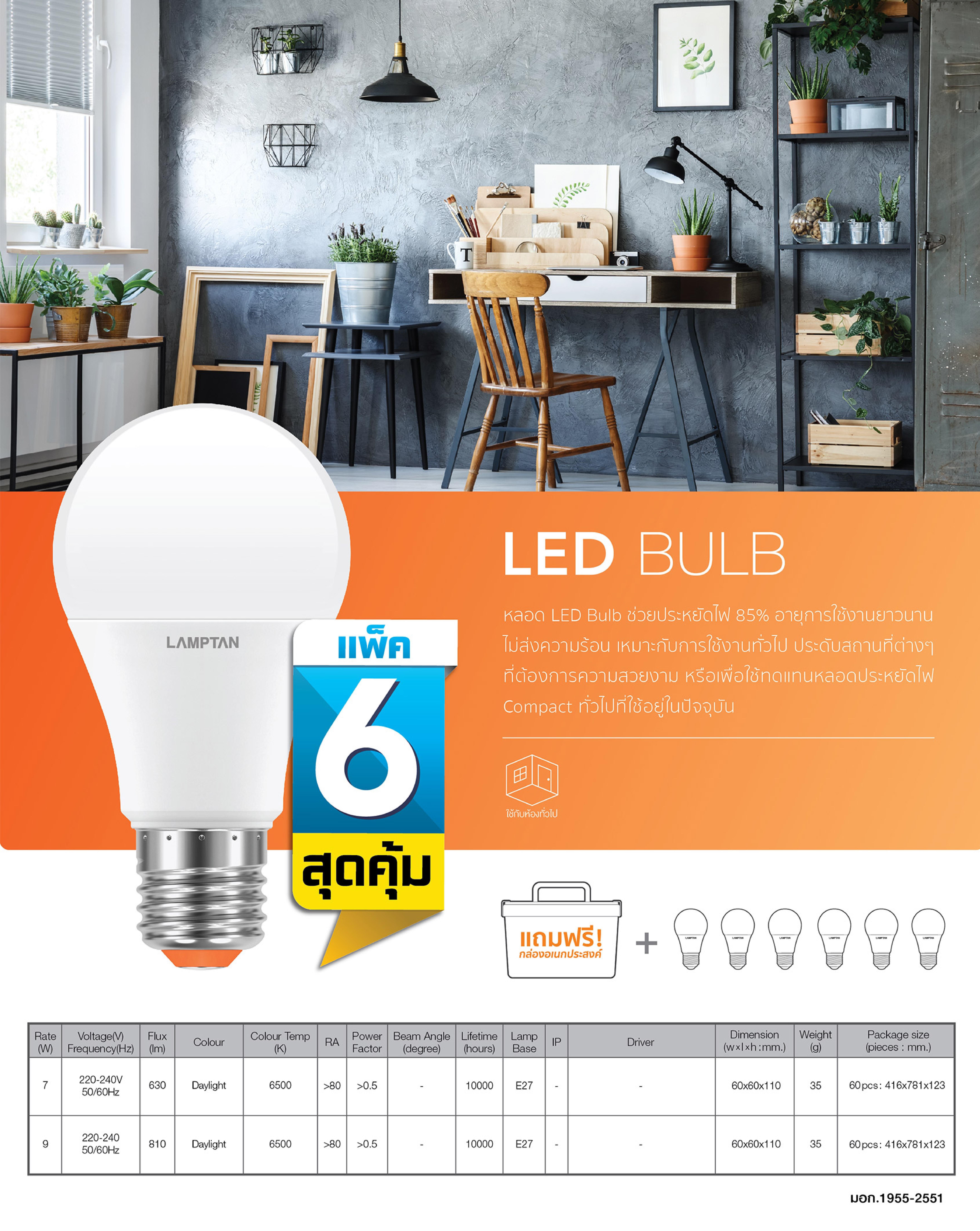 หลอด LED ขนาดกำลังไฟ 7 วัตต์ ประหยัดไฟมากขึ้น 85 % แถมกล่องพลาสติกเอนกประสงค์ ใช้ทดแทนหลอดไส้ หรือหลอดประหยัดไฟคอมแพ็ก อายุการใช้งานยาวนานถึง 10 ปี (ขึ้นอยู่กับลักษณะการใช้งาน และสภาพแวดล้อม) สินค้าได้รับการรับรองคุณภาพ และมาตรฐาน มอก.1955-2551